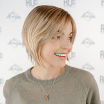 Kolor oferowanej peruki jest pokazany na zdjęciu z modelką na tle firmowej ścianki i na plastikowej główce.