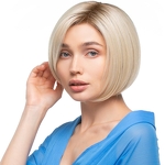 Modelka w niebieskim stroju prezentuje perukę w kolorze 24/60/8R.