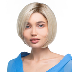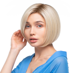 Modelka w niebieskim stroju prezentuje perukę w kolorze 24/60/8R.