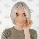 Kolor oferowanej peruki pokazany jest na zdjęciu z modelką na tle ścianki firmowej.