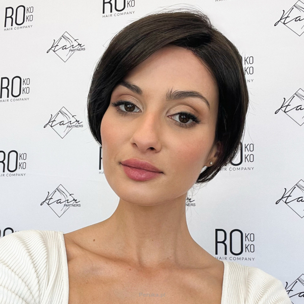 Kolor oferowanej peruki pokazany jest na zdjęciu z modelką na ściance firmowej i w kwadracie z odcieniem.