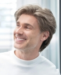 Peruka męska Gary to model z włosów syntetycznych utkanych na bazie, którą charakteryzuje wykonanie maszynowe na tresach, mikroskóra na górnej części głowy oraz linia rozmyta z przodu.