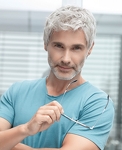 Peruka męska George 5 Stars to model z włosów syntetycznych utkanych na bazie, którą charakteryzuje wykonanie ręczne na tiulu oraz linia rozmyta z przodu.