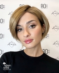 Zdjęcie modelki na szarym tle, na stojaku i od spodu produktu prezentuje kolor sandyblonde/rooted.