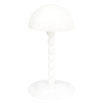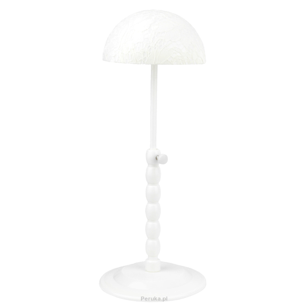 Górna część stojaka, tzw. półgłówek, jest pokryta białym koronkowym materiałem. Materiał ma ciekawą fakturę i zapobiega przesuwaniu się peruki. To ogranicza ryzyko, że peruka zsunie się ze stojaka i zabrudzi lub zakurzy.