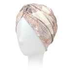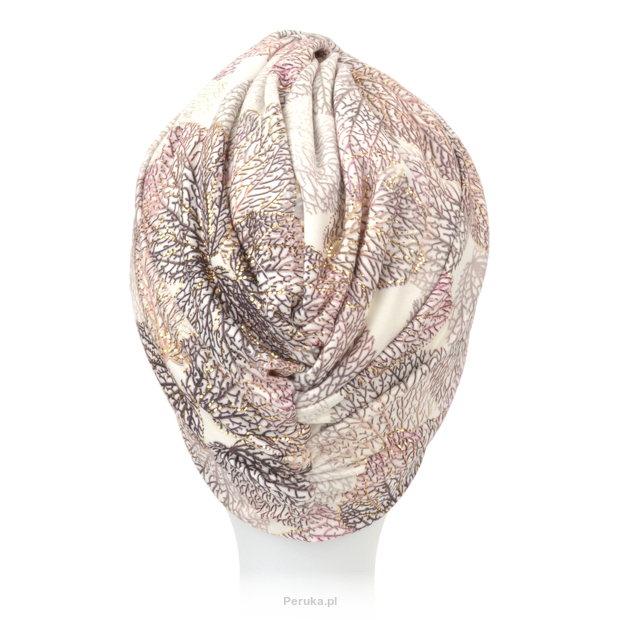 Lekki, ciepły turban z podszewką. Nawiązanie do stylu retro w tym modelu osiągnięto poprzez zebranie tkaniny w kształt odwróconego V nad czołem.