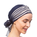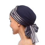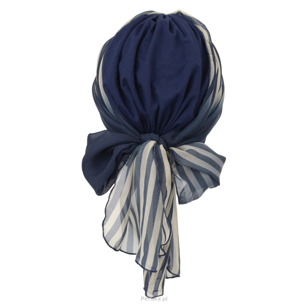 Turban granatowy z długą ozdobną szarfą w paski BEATA sz. 429+BM20