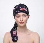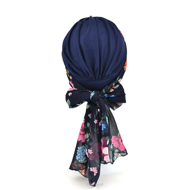 Turban z długą ozdobną szarfą w kwiaty granatowy BEATA sz-6+10*
