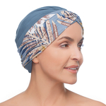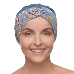 Lekki, codzienny turban z ozdobną szarfą. Upięcie nad czołem nadaje klasycznego kształtu i powiększa optycznie nakrycie głowy. Fantazyjny wzór szarfy ożywi stylizację.