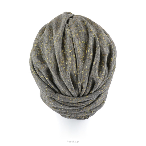 Marszczony turban z krzyżowanym frontem szary z drobnym złotym wzorem GALAXY