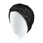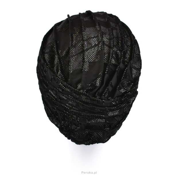 Glamour to lekki i cieplejszy turban wykonany z elastycznych materiałów, które zapewniają odpowiednią wentylację skóry na głowie. Niewielka waga daje komfort przy codziennym użytkowaniu, nawet po wielu godzinach noszenia. Bogate, wielowarstwowe marszczenie wierzchniego materiału jest uzupełnione ozdobnym ukośnym łączeniem pasm na wysokości czoła. Takie połączenie dodaje mu wizualnej objętości. Czarny kolor ze srebrnym wykończeniem będzie pasować do wielu stylizacji.