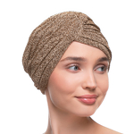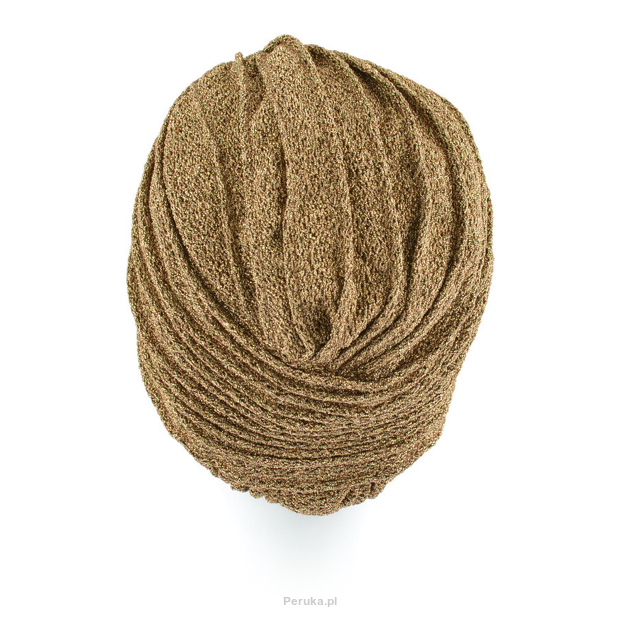 Gold to lekki oraz ciepły turban. Wykonany z przewiewnych i elastycznych tkanin, oferuje komfort użytkowania przez wiele godzin i zapewnia odpowiednią wentylację głowy. Z przodu posiada dekoracyjne połączenie materiału, które jest uzupełnione marszczeniami po bokach oraz z tyłu, co dodaje mu objętości. Turban posiada jednolite złote wykończenie kolorystyczne.