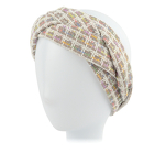 Turban Madame ma ciekawy wzór oparty na kratce, uzupełniony niewielkimi kolorowymi aplikacjami.