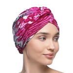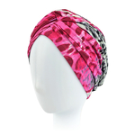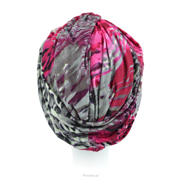 Magenta to turban z przewiewną podszewką. Materiał wewnętrznej warstwy został wykonany z włókien bambusowych, które zapewniają komfort termiczny oraz łatwe dopasowanie do kształtu głowy. Kolory turbanu to głównie odcienie różu, czerwieni i fioletu z przodu oraz częściowo na górze. W tylnej części produktu dominują szarości. Pasma materiału turbanu Magenta są z przodu zebrane nieco do góry i połączone skośnym węzełkiem, który pełni rolę dekoracyjną. Wierzchnia warstwa turbanu została bogato pomarszczona, aby uzyskać pożądany efekt zwiększonej objętości po założeniu.