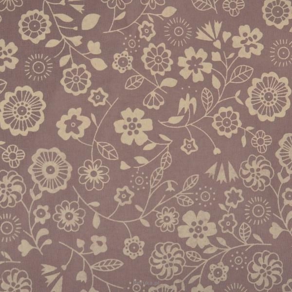 Kolor oferowanego turbanu znajduje się w kwadracie obok zdjęcia z modelką. Sahara Flora to fioletowobrązowe tło i beżowo-różowe gęste kwiatuszki.