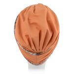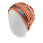 Czepek jest przewiewny i doskonale sprawdzi się w roli samodzielnego nakrycia głowy. Można go uzupełnić o jedną z dwóch opasek, aby nadać unikalnego charakteru swojej stylizacji. Dzięki temu turban będzie pasować do wielu okazji. Jedna opaska to stonowane zestawienie kolorów, natomiast wykończenie drugiej to abstrakcyjne wzory, które kontrastują z gładką czapeczką.