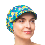Turban z daszkiem i wiązaniem z tyłu turkusowo granatowo żółty wzór PALERMO Q-404