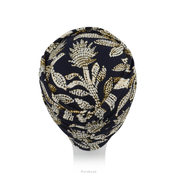 Lekki, przewiewny turban z wyrazistym, kwiatowym wzorem. Elastyczny materiał nie uciska głowy nawet po wielu godzinach noszenia.