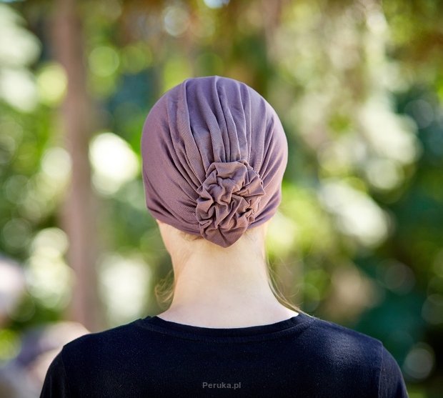 Elementem ozdobnym turbanu jest udrapowana z tyłu róża, do której prowadzą łagodne drapowania. Turban wygląda elegancko, jest wygodny i wprost idealny do codziennego użytku.