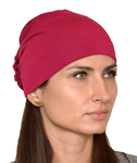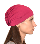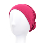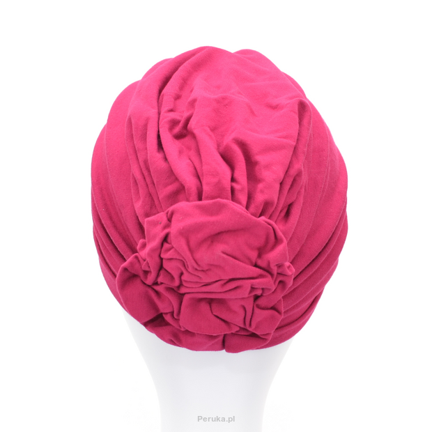 Elementem ozdobnym turbanu jest udrapowana z tyłu róża, do której prowadzą łagodne drapowania. Turban wygląda elegancko, jest wygodny i wprost idealny do codziennego użytku.