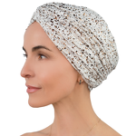 Jasny turban RIGA B150+B07 z delikatnym wzorem i ozdobnymi marszczeniami. Został wykonany z oddychającego materiału, co znacznie wpływa na komfort noszenia. Turban idealnie sprawdzi się do codziennych stylizacji. Minimalna zawartość elastanu sprawia, że turban idealnie przylega do Twojej głowy.