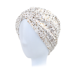 - stylowy turban z ozdobnym złotym printem,