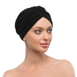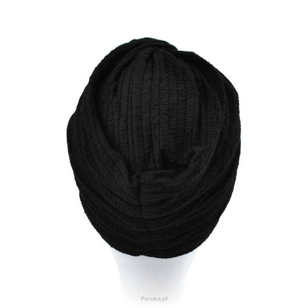 Cieplejszy model turbanu nawiązujący do stylu retro poprzez zebranie materiału w odwrócone "V" nad czołem. Ma lekko wydłużony kształt i sporo marszczeń nadających objętości.