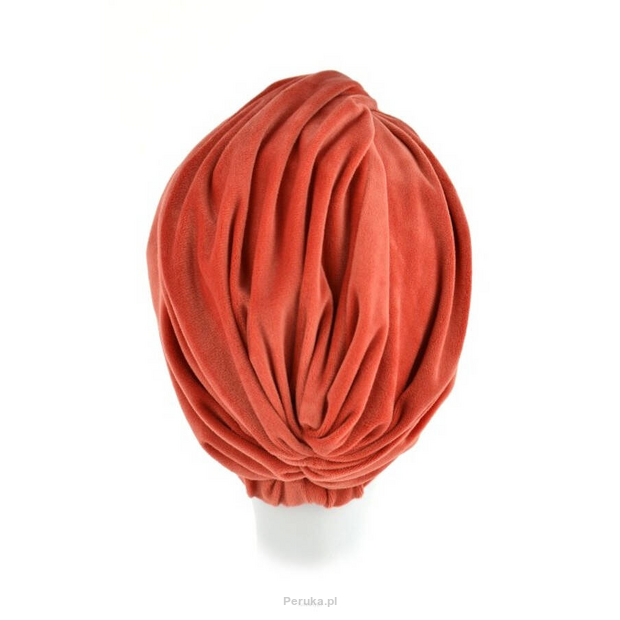 Cieplejszy model turbanu nawiązujący do stylu retro poprzez zebranie materiału w odwrócone "V" nad czołem. Ma lekko wydłużony kształt i sporo marszczeń nadających objętości.