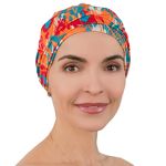 Materiał układa się w subtelne fałdy, tworząc elegancką i ciekawą strukturę wokół głowy. Turban wyróżnia się wielokolorowym, abstrakcyjnym wzorem łączącym jasne i bardziej intensywne odcienie. Motyw przypomina artystyczne pociągnięcia pędzla lub styl ikat, dzięki czemu model przyciąga uwagę i nadaje stylizacji wyjątkowego charakteru.